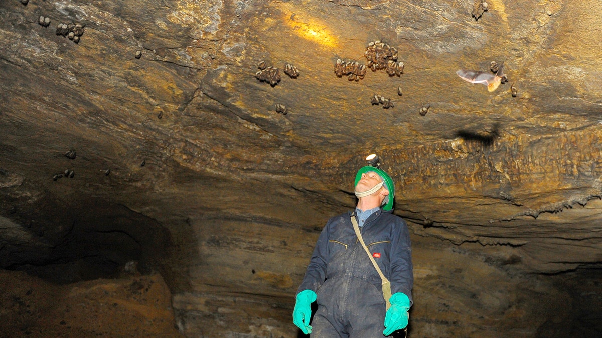 The disease shows visible white fungal growth on infected bats’ muzzles and wings.
