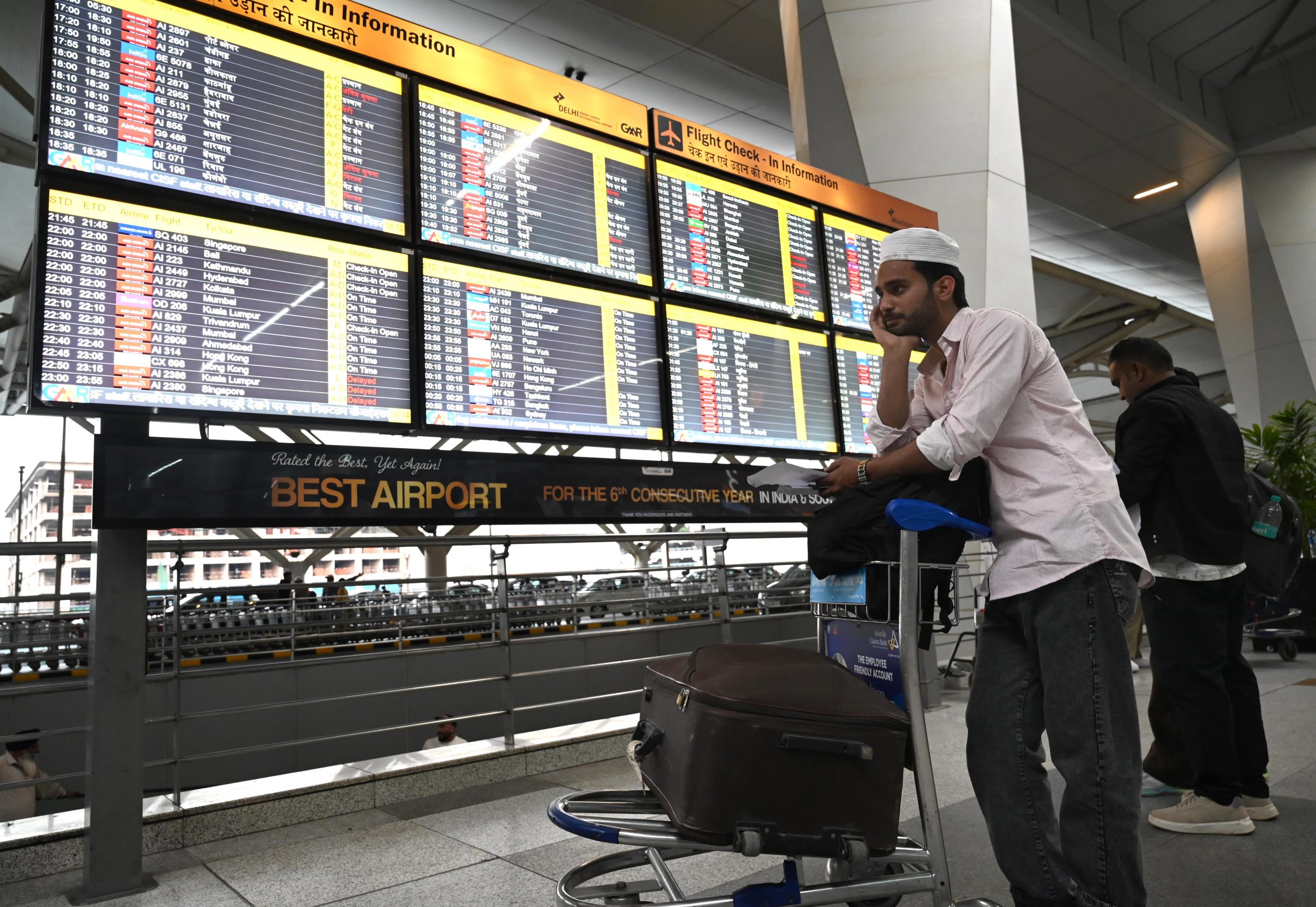 A passenger Mohd Umardaraz from Bijnor Uttar Pradesh stranded at Terminal-3 Delhi airport after his flight for Kuwait is cancelled due to airspace restrictions over Iran and parts of the Middle East on March 1, 2026 in New Delhi, India.