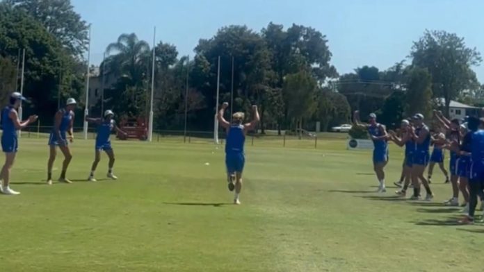 Dogs teammates lined up either side of the goalsneak and cheered as he set off Rocky-style at Whitten Oval.