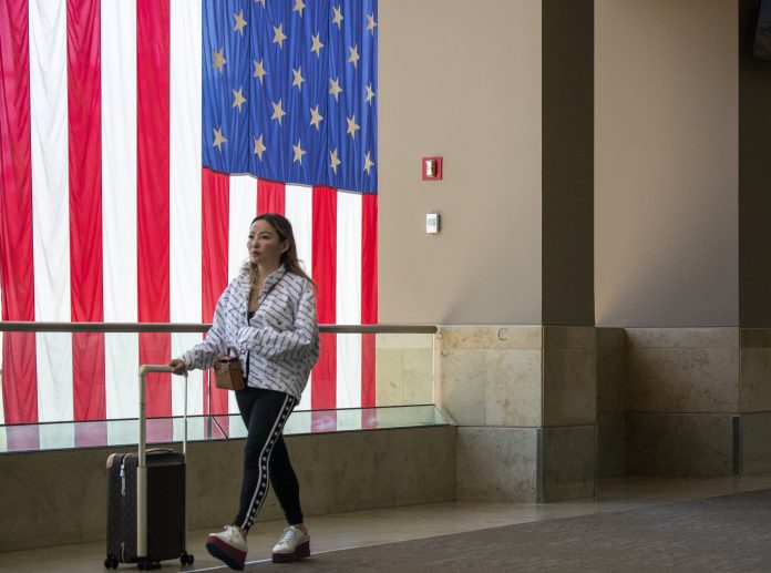 A passenger passes a giant American flag as they make their way to and from their gates during the Memorial Day weekend getaway at John Wayne Airport Orange County in John Wayne Airport, Santa Ana, CA on Thursday, May 26, 2022.