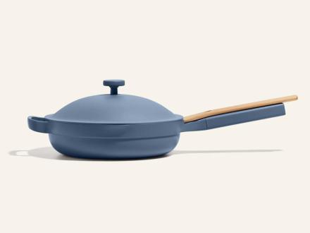 The 10.5-inch Always Pan 2.0 is perfect for pan-frying things like eggs and grilled cheese sandwiches, but it also has a 2.6-quart capacity with a depth of 2.8 inches so you can boil things like pasta as well. Bonus: It comes with a steamer basket that fits in the pan so you can use it to strain said pasta. It also includes a tight-fitting lid and two spouts on both sides for easy pouring. Another bonus: It has a beechwood spatula that hooks onto the spoon-rest-like handle of the pan, making storage simple.