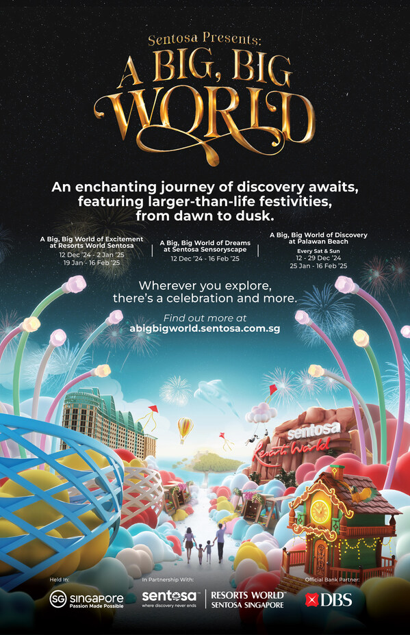 SINGAPORE, Dec. 19, 2024 /PRNewswire/ — This festive season, immerse yourself in larger-than-life experiences at “Sentosa Presents: A Big, Big World“. For the first time ever, the island transformation is set to transport visitors to three distinct and unique whimsical realms across Resorts World Sentosa, Sentosa Sensoryscape, and Palawan Beach. From 9 December 2024 to 16 February 2025, evolving interactive installations and day-to-night activities from Christmas to Chinese New Year will enchant and captivate visitors of all ages, with about 50 exclusive deals across some 40 Sentosa island partners for DBS and POSB debit and credit cardholders[1].
