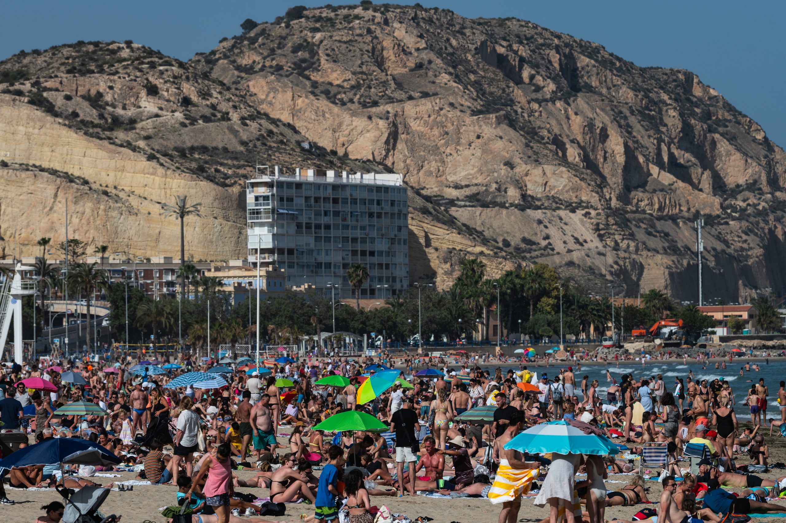 Tourists and locals enjoy a warm spring day with high temperatures in El Postiguet Beach.